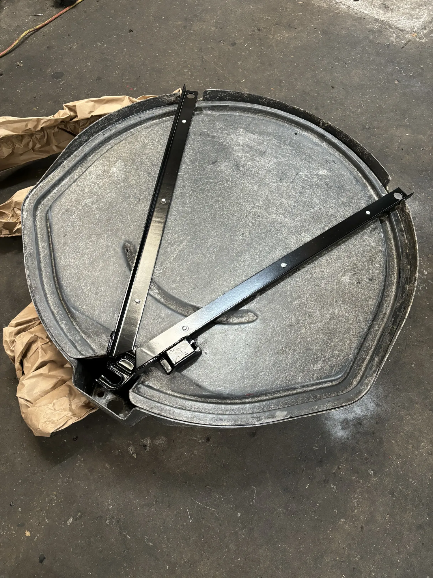 With the spare wheel tub removed, I carefully stripped the paint from the fiberglass using a gentle citrus stipper (to avoid damaging the fiberglass). This was a very slow process, but the end result was very clean fiberglass with surprisingly little damage (I guess the paint may have been protecting it from the elements). I stripped the metal frame to bare metal and repainted satin black using Duplicolor engine enamel, making sure to mask the silver rivets so they remain unpainted (as they were from the factory).