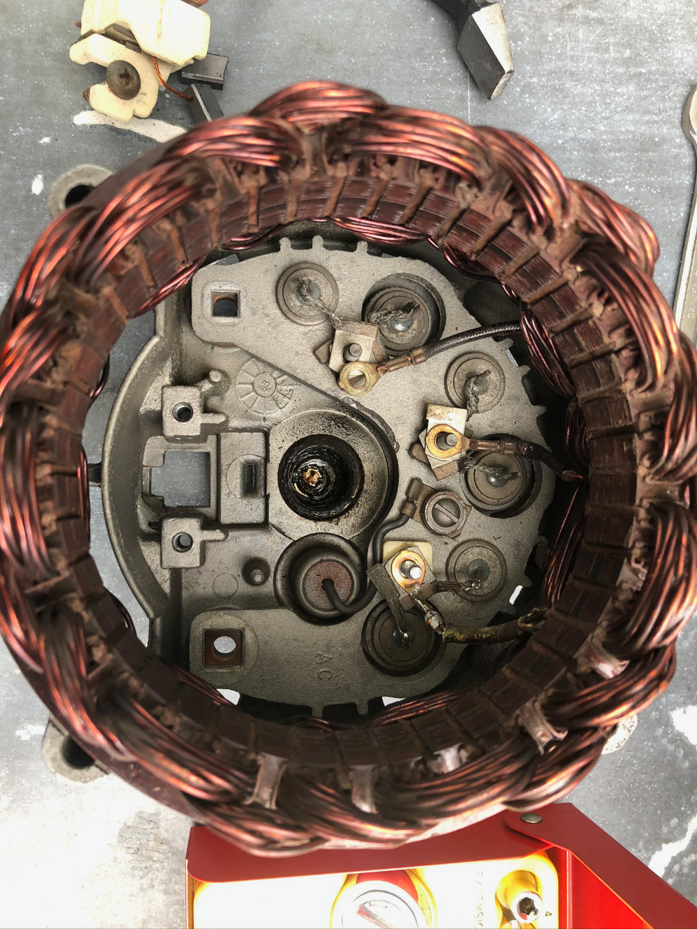 I cleaned the armature and stator with circuit board cleaner, and repainted the section of the stator that can be seen from the outside (where the case joins). The pulley was polished up with Scotch Brite and metal polish, and the fan was stripped to bare metal and repainted with Eastwood Clear Zinc finish.