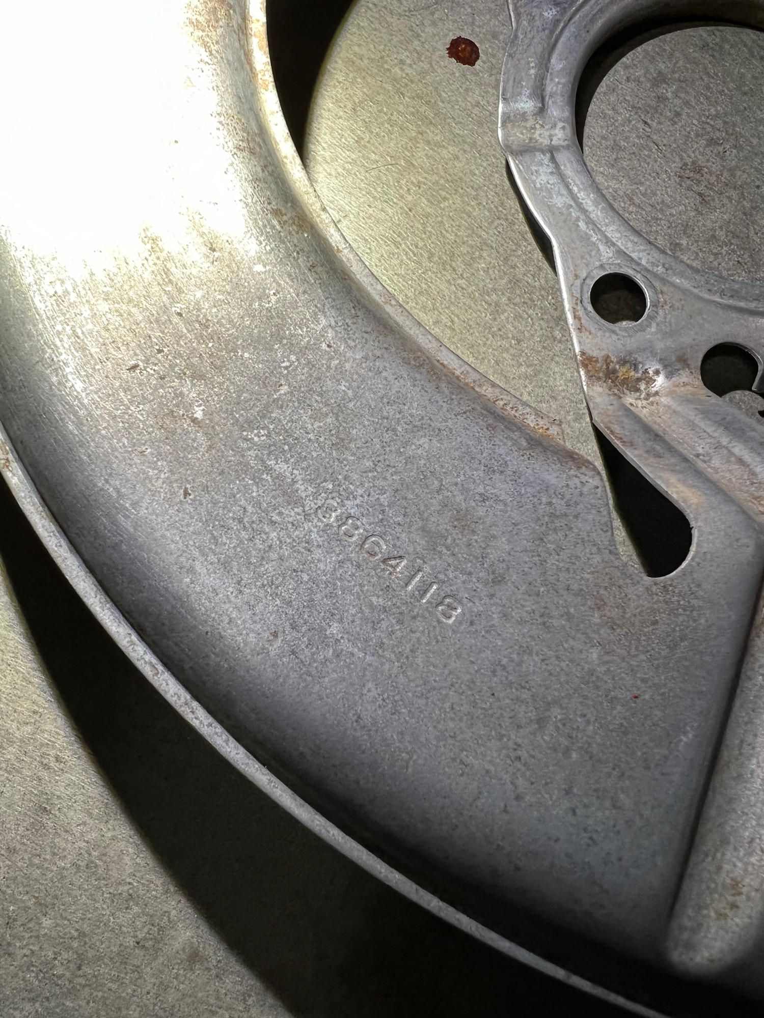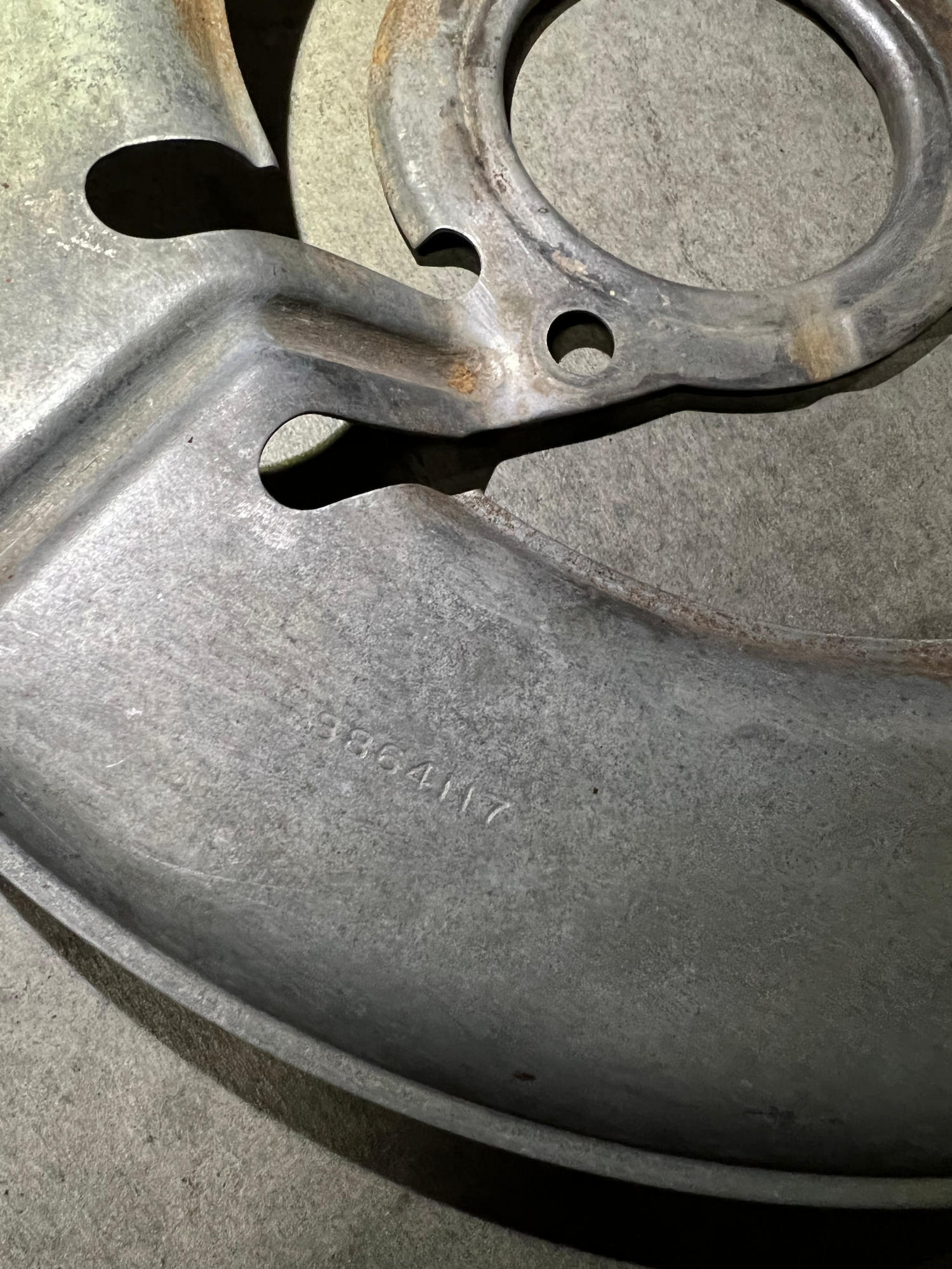 The calipers and dust shields pictured above were removed from the front of the Red Rocket when the Wilwood brakes were fitted. The calipers have the casting numbers #5473796 and #5452270, which makes them a mix of Second and Third Design (refer table above). One of the calipers uses a #5473796 casting on one half and #5452270 on the other — so a single caliper is made up of parts from different designs! The dust shields are correct and, given that the brakes discs were still riveted on, almost certainly original. They have the correct OE GM part numbers stamps (3864117 and 3864118).