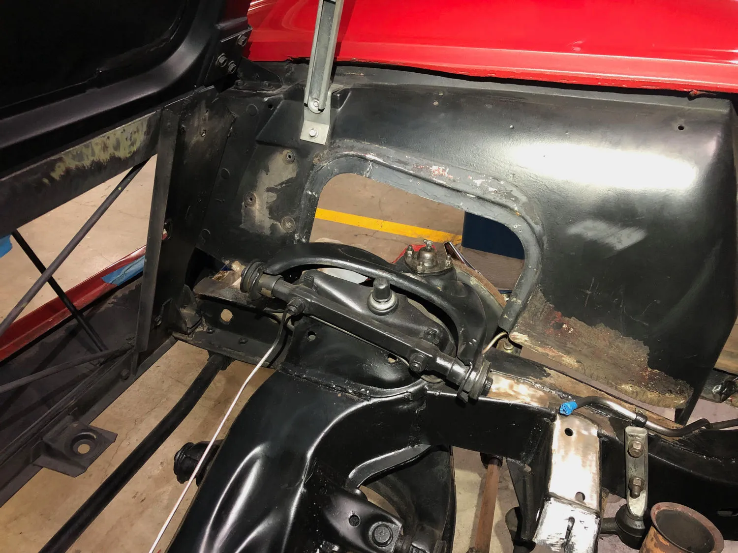 I planned to do a few touch-ups on the frame in the engine bay. With the engine out, it was possible to get to some areas that would be inaccessible normally. The leaking steering box had damaged the paint on the frame, so I cleaned up that area using a wire brush and red scotch-brite, covered the car in plastic (to prevent any overspray) and painted that section of the frame with Eastwood Extreme Chassis Black Primer followed by Eastwood Extreme Chassis Black Satin. Job done.