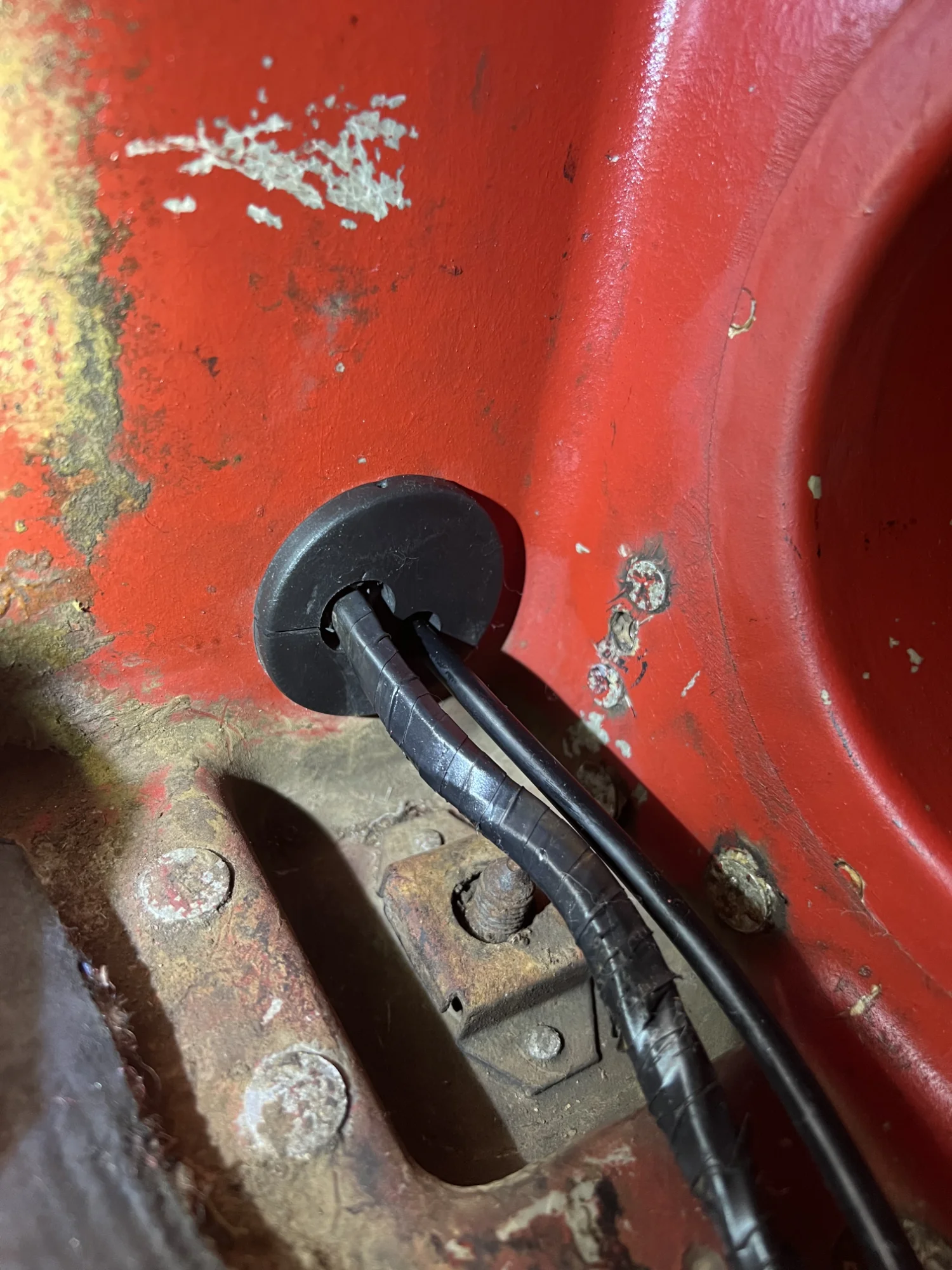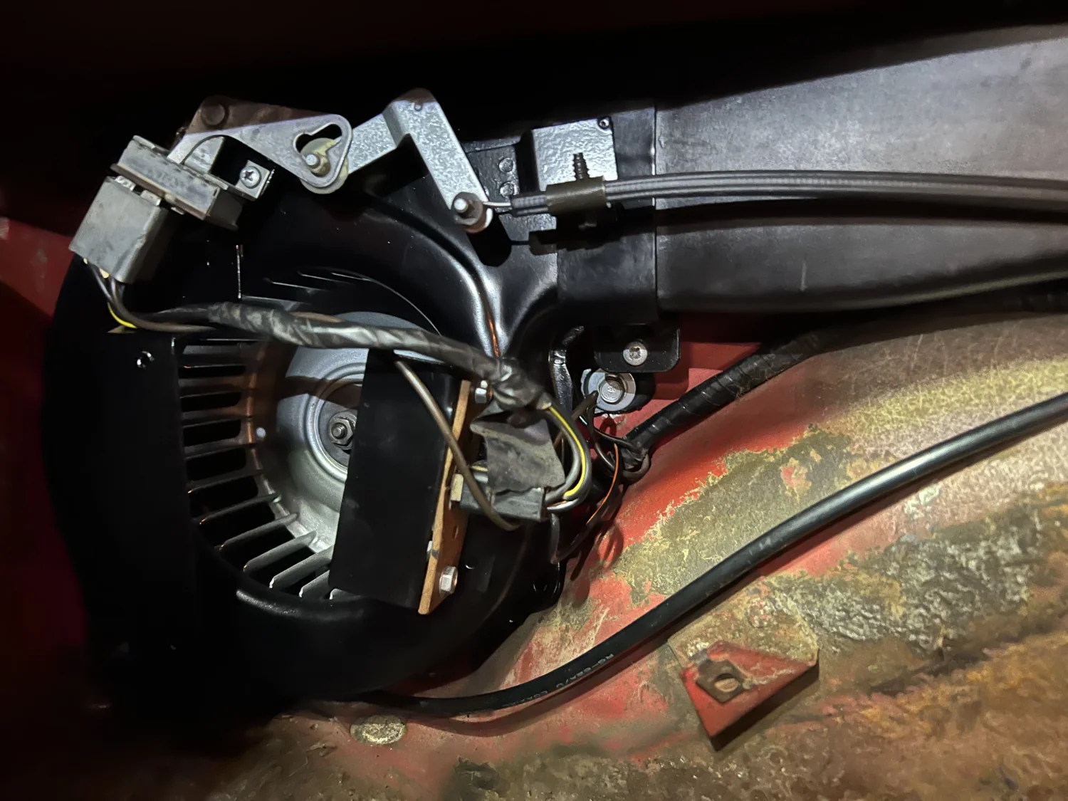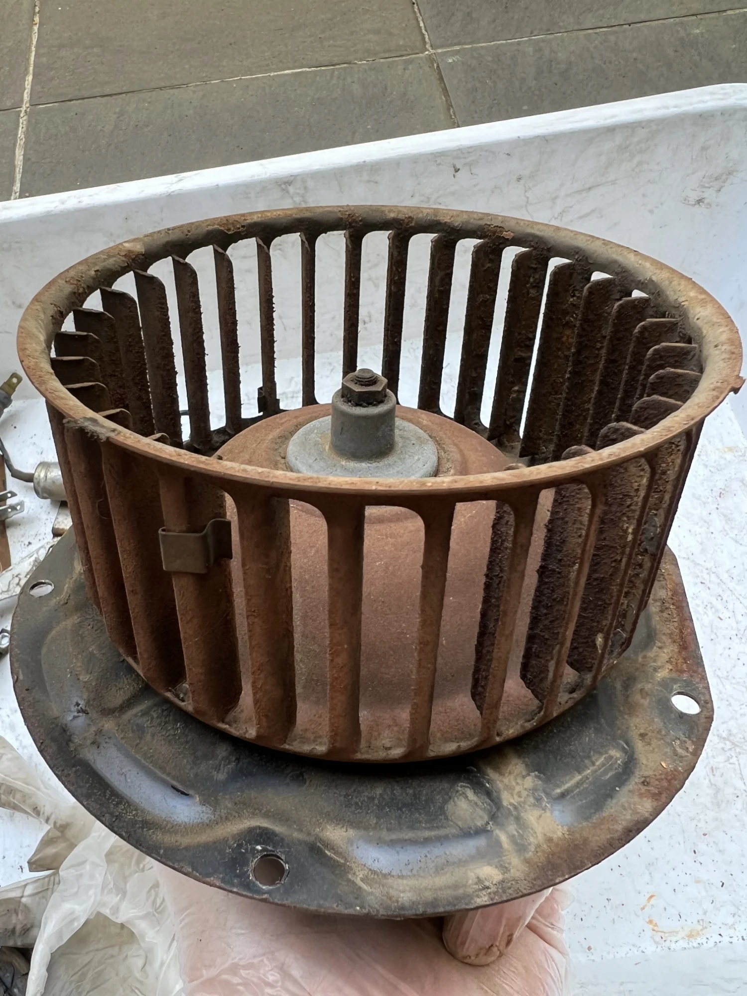 Cleaned and repainted blower housing and fan look like new. I resealed the ducting using self-adhesive foam strip. Fitted new antenna/wiring harness grommet. The indentation in the inner guard is to accommodate the blower motor. Note how nice the fiberglass looks. Also note the view down the b-pillar showing the 'bird cage' with its original, green zinc chromate paint — the bird cage is untouched and completely rust free. With everything reinstalled the new antenna cable runs under blower motor, it's impossible to replace with the motor in place.