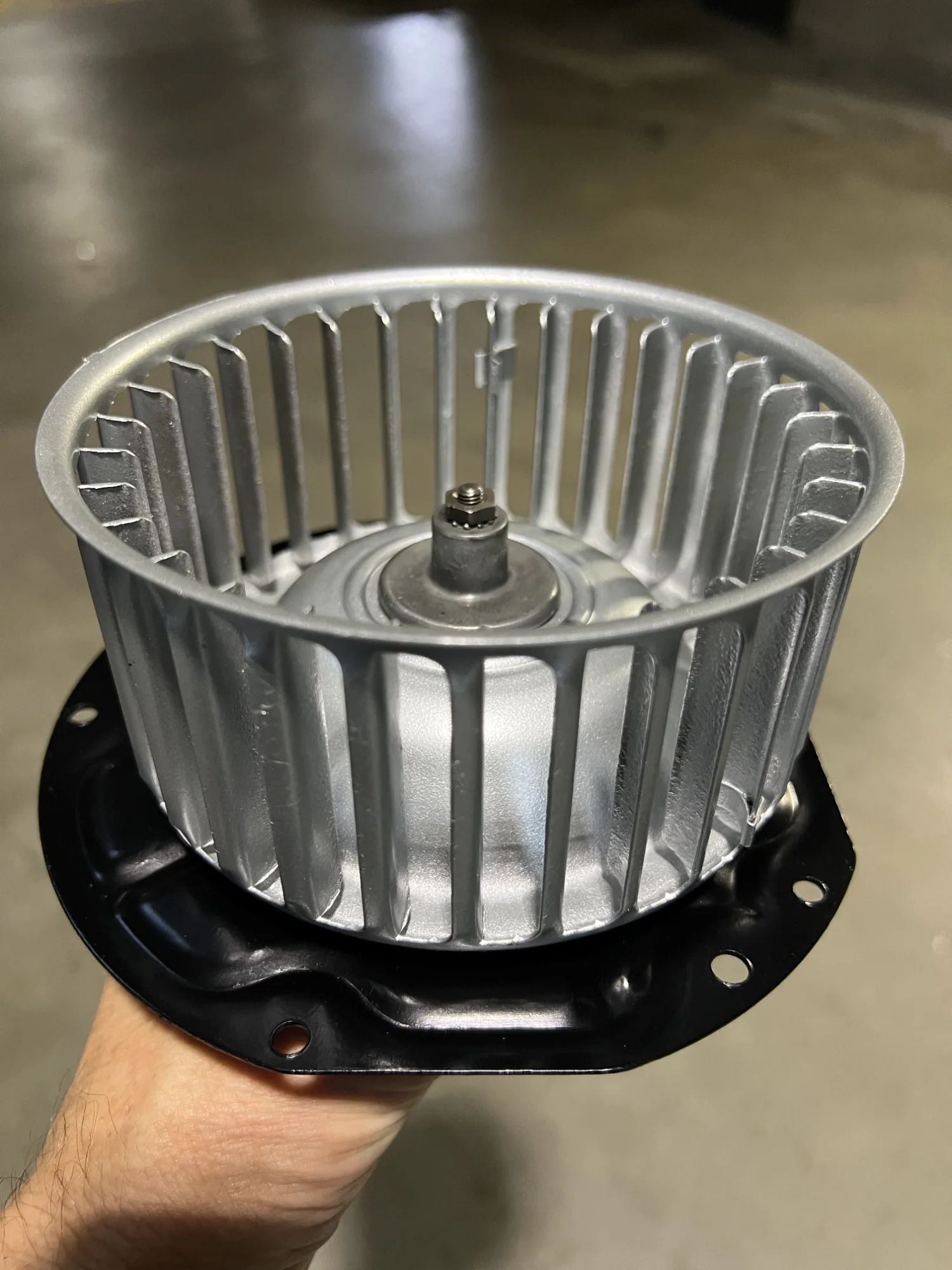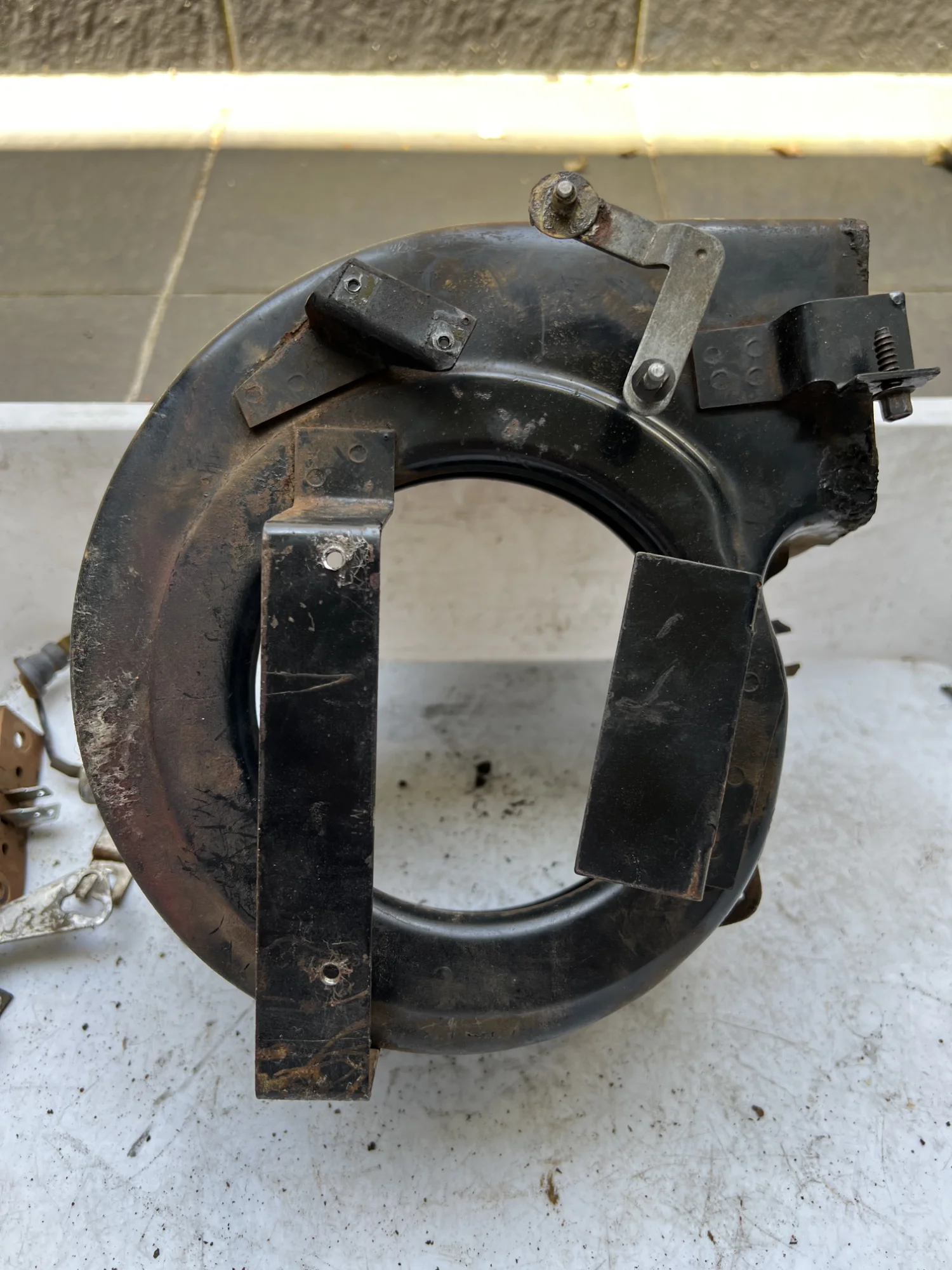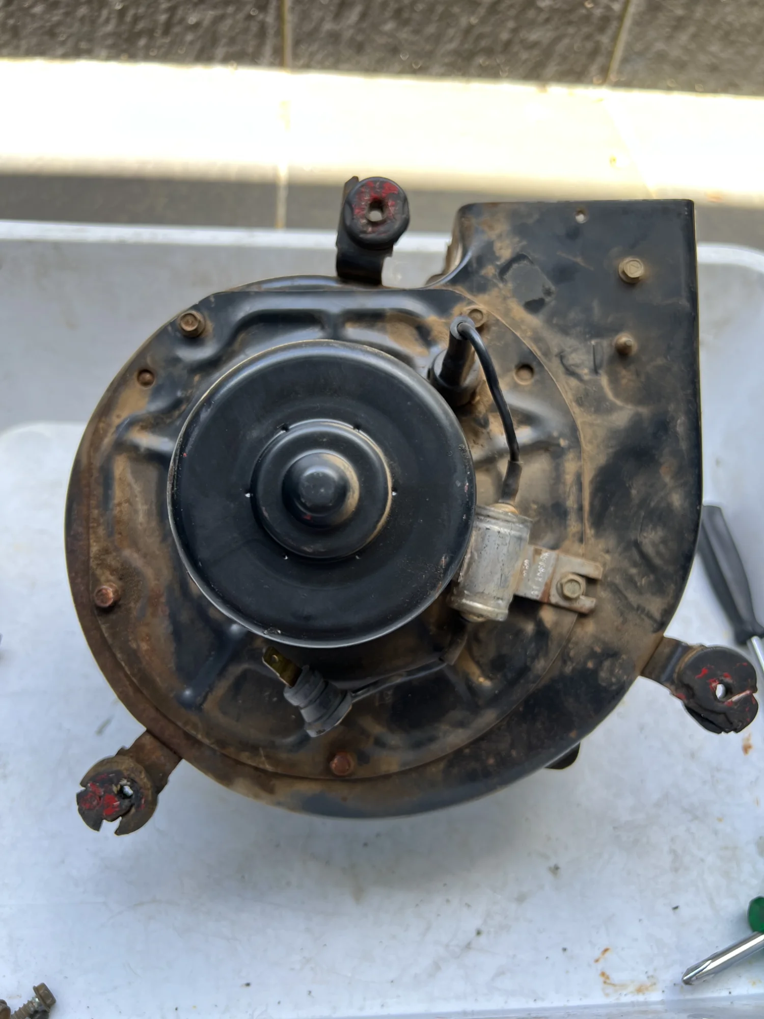 Cleaned and repainted blower housing and fan look like new. I resealed the ducting using self-adhesive foam strip. Fitted new antenna/wiring harness grommet. The indentation in the inner guard is to accommodate the blower motor. Note how nice the fiberglass looks. Also note the view down the b-pillar showing the 'bird cage' with its original, green zinc chromate paint — the bird cage is untouched and completely rust free. With everything reinstalled the new antenna cable runs under blower motor, it's impossible to replace with the motor in place.